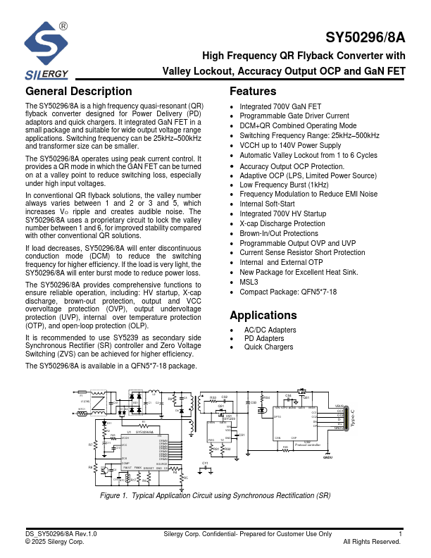 The SY50296/8A is a high frequency quasi-resonant (QR) flyback converter designed for Power Delivery (PD) adaptors and quick chargers. It integrated GaN FET in a small package and suitable for wide output voltage range applications.