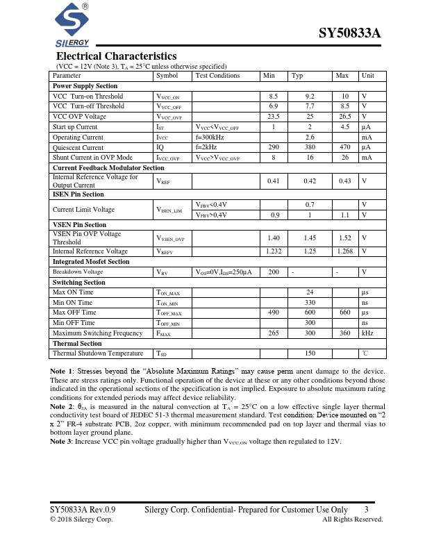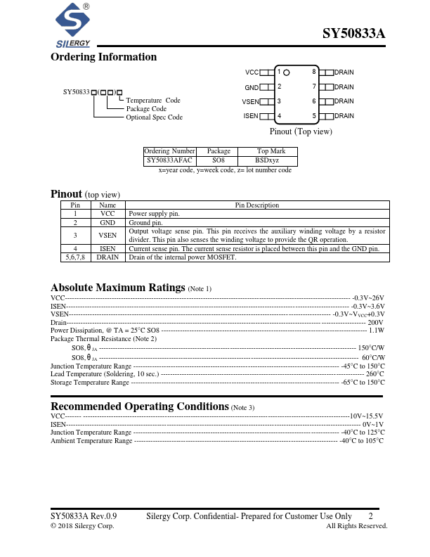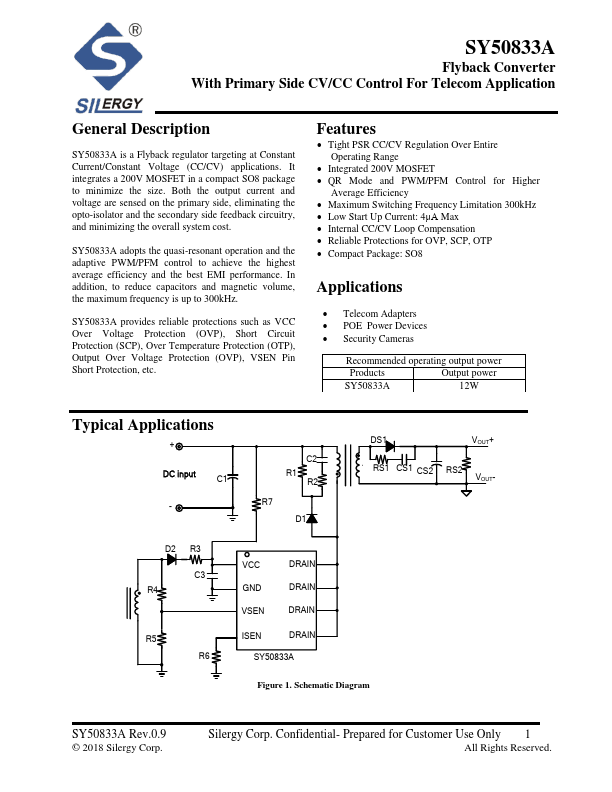 SY50833A is a Flyback regulator targeting at Constant Current/Constant Voltage (CC/CV) applications. It integrates a 200V MOSFET in a pact SO8 package to minimize the size. Both the output current and voltage are sensed on the primary side, eliminating the opto-isolator and the secondary side feedback circuitry, and minimizing the overall system cost.