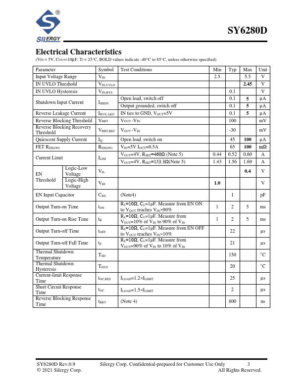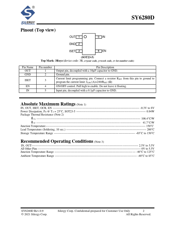 The SY6280D is an ultra-low RDS(ON) Power Distribution switch with current limit to protect the power source from over current and short circuit conditions. It incorporates over temperature protection and reverse blocking function. Ordering Information SY6280 □(□□ □) Package Code Optional Spec Code Ordering Number Package Type Note SY6280DAAT SOT23-5 SY6280D Low Loss Power Distribution Switch with Programmable...