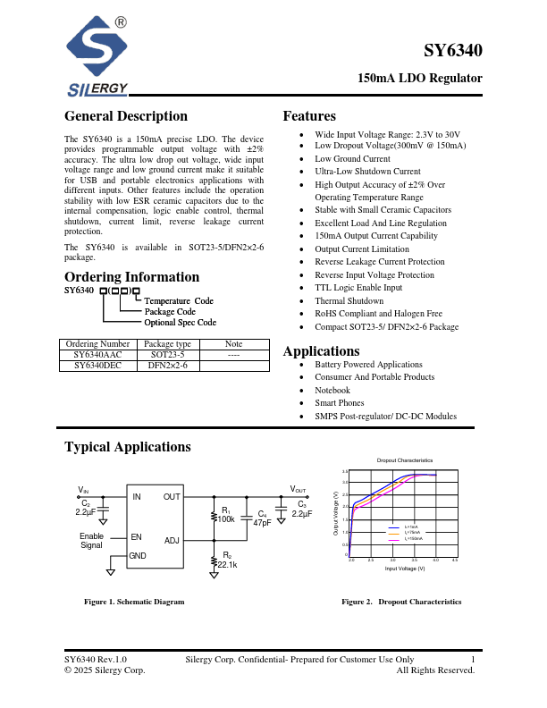 The SY6340 is a 150mA precise LDO. The device provides programmable output voltage with ±2% accuracy. The ultra low drop out voltage, wide input voltage range and low ground current make it suitable for USB and portable electronics applications with different inputs.