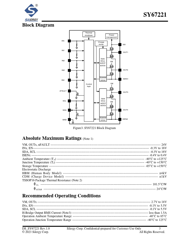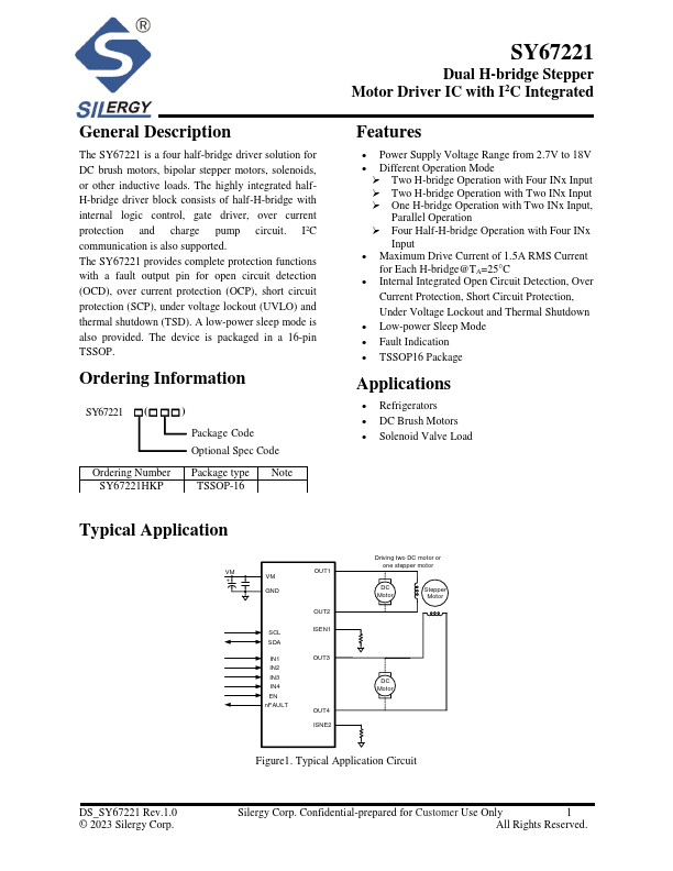 The SY67221 is a four half-bridge driver solution for DC brush motors, bipolar stepper motors, solenoids, or other inductive loads. The highly integrated halfH-bridge driver block consists of half-H-bridge with internal logic control, gate driver, over current protection and charge pump circuit. I2C munication is also supported.