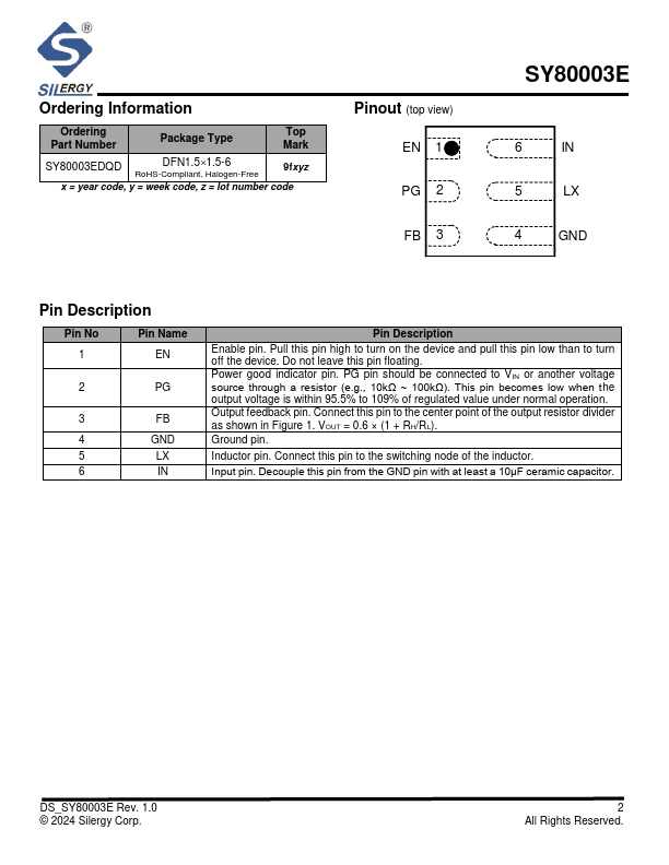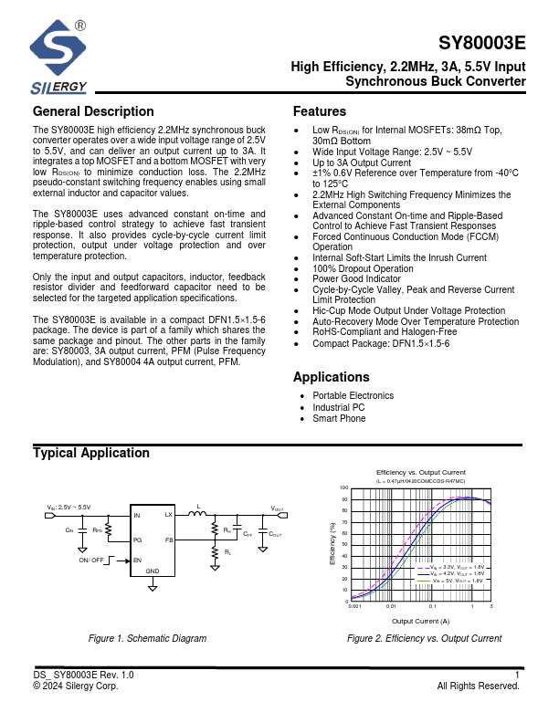 The SY80003E high efficiency 2.2MHz synchronous buck converter operates over a wide input voltage range of 2.5V to 5.5V, and can deliver an output current up to 3A. It integrates a top MOSFET and a bottom MOSFET with very low RDS(ON) to minimize conduction loss. The 2.2MHz pseudo-constant switching frequency enables using small external inductor and capacitor values.