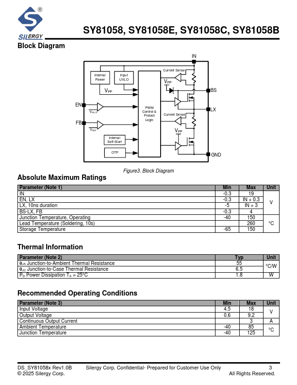 The SY81058x is high efficiency synchronous buck converter operates over a wide input voltage range of 4.5V to 18V, and can deliver an output current up to 3A. It integrates a top MOSFET and a bottom MOSFET with very low RDS(ON) to minimize conduction loss. The 500kHz or 1200kHz high pseudo-constant switching frequency enables using small external inductor and capacitor values.
