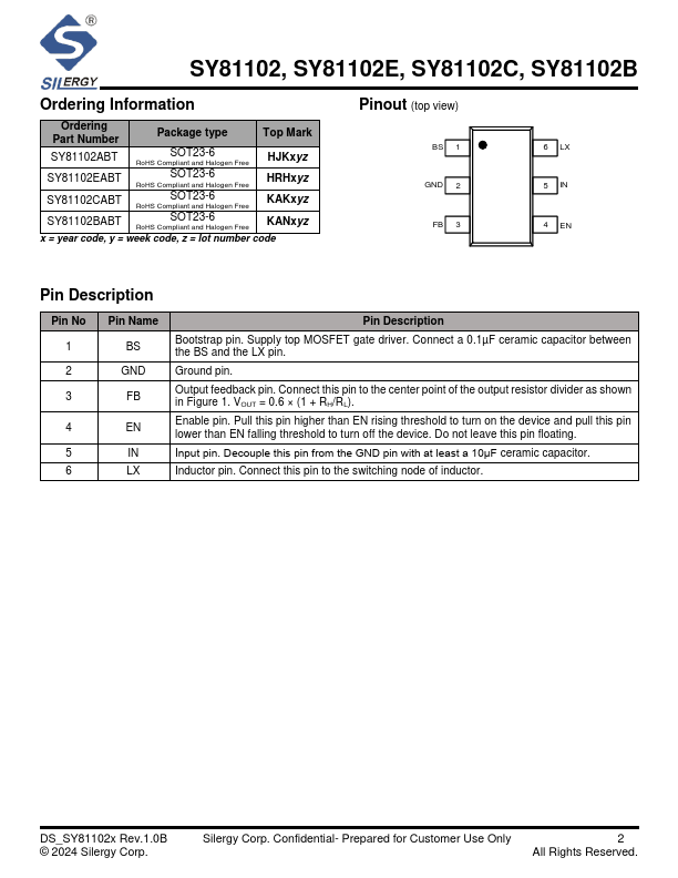 The SY81102x is high efficiency synchronous buck converter operates over a wide input voltage range of 4.5V to 18V, and can deliver an output current up to 2A. It integrates a top MOSFET and a bottom MOSFET with very low RDS(ON) to minimize conduction loss. The high pseudo-constant switching frequency enables using small external inductor and capacitor values.