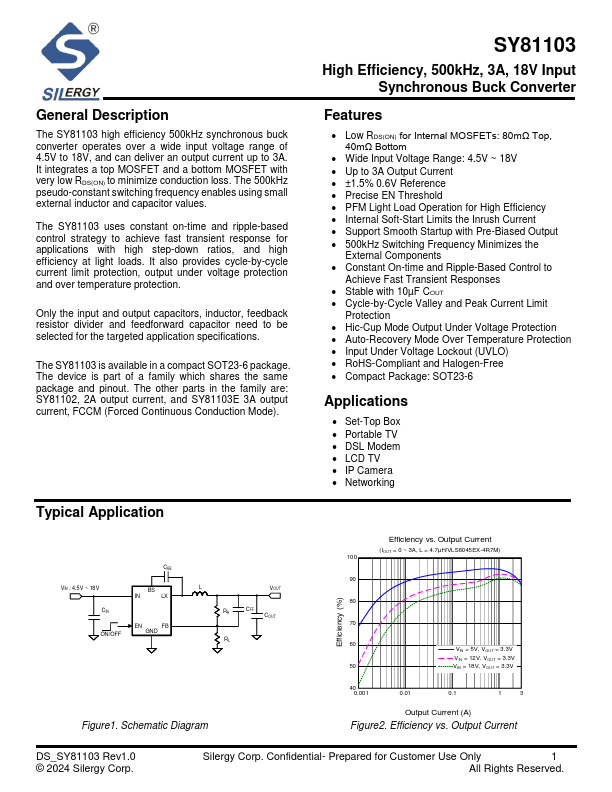 The SY81103 high efficiency 500kHz synchronous buck converter operates over a wide input voltage range of 4.5V to 18V, and can deliver an output current up to 3A. It integrates a top MOSFET and a bottom MOSFET with very low RDS(ON) to minimize conduction loss. The 500kHz pseudo-constant switching frequency enables using small external inductor and capacitor values.