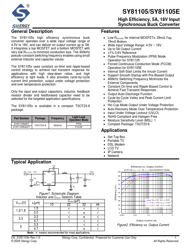 The SY81105x high efficiency synchronous buck converter operates over a wide input voltage range of 4.5V to 18V, and can deliver an output current up to 5A. It integrates a top MOSFET and a bottom MOSFET with very low RDS(ON) to minimize conduction loss. The 400kHz pseudo-constant switching frequency enables using small external inductor and capacitor values.