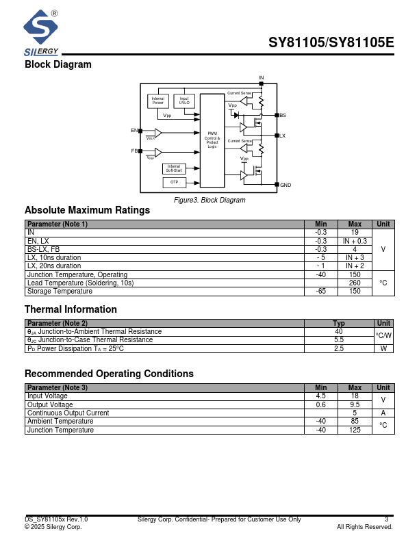 The SY81105x uses constant on-time and ripple-based control strategy to achieve fast transient response for applications with high step-down ratios, and high efficiency at light loads. It also provides cycle-by-cycle current limit protection, output under voltage protection and over temperature protection.