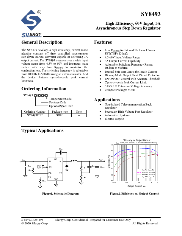 The SY8493 develops a high efficiency, current mode adaptive constant off time controlled, asynchronous step-down DC/DC converter capable of delivering 3A output current. The SY8493 operates over a wide input voltage range from 4.5V to 60V and integrates main switch with very low RDS(ON) to minimize the conduction loss. The switching frequency is adjustable from 100kHz to 500kHz using an external resistor.