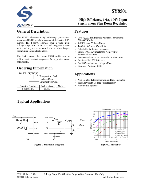 The SY8501 develops a high efficiency synchronous step down DC/DC regulator capable of delivering 1.0A current. The SY8501 operates over a wide input voltage range from 7V to 100V and integrates a main switch and a synchronous switch with very low RDS(ON) to minimize the conduction loss.