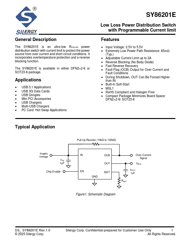 The SY86201E is an ultra-low RDS(ON) power distribution switch with current limit to protect the power source from over current and short circuit conditions. It incorporates overtemperature protection and a reverse blocking function.