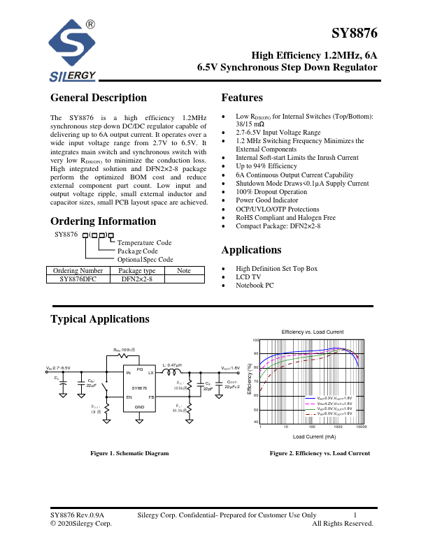 Features The SY8876 is a high efficiency 1.2MHz synchronous step down DC/DC regulator capable of delivering up to 6A output current. It operates over a wide input voltage range from 2.7V to 6.5V. It integrates main switch and synchronous switch with very low RDS(ON) to minimize the conduction loss.