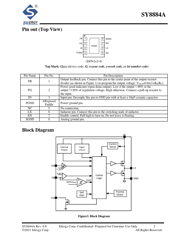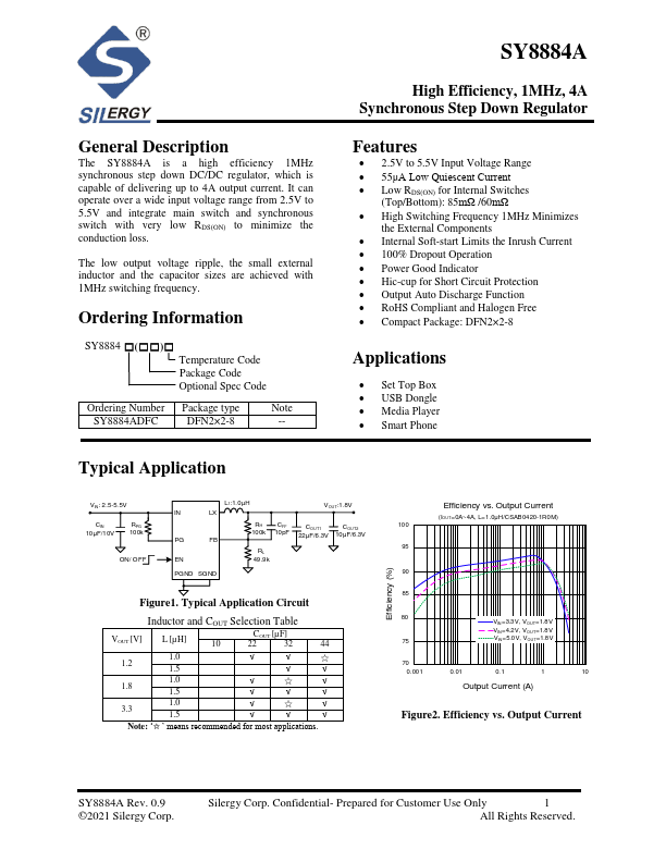 The SY8884A is a high efficiency 1MHz synchronous step down DC/DC regulator, which is capable of delivering up to 4A output current. It can operate over a wide input voltage range from 2.5V to 5.5V and integrate main switch and synchronous switch with very low RDS(ON) to minimize the conduction loss. The low output voltage ripple, the small external inductor and the capacitor sizes are achieved with 1MHz switching...