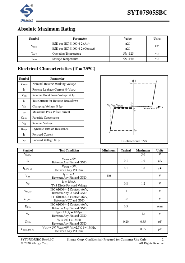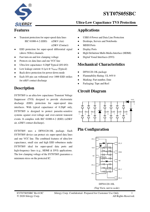 SYT07S05 is an ultra-low capacitance Transient Voltage Suppressor (TVS) designed to provide electrostatic discharge (ESD) protection for super-speed data interfaces. With typical capacitance of 0.20pF only, SYT07S05 is designed to protect parasitic-sensitive systems against over-voltage and over-current transient events. It plies with IEC 61000-4-2 (ESD) (±20kV air, ±20kV contact discharge).