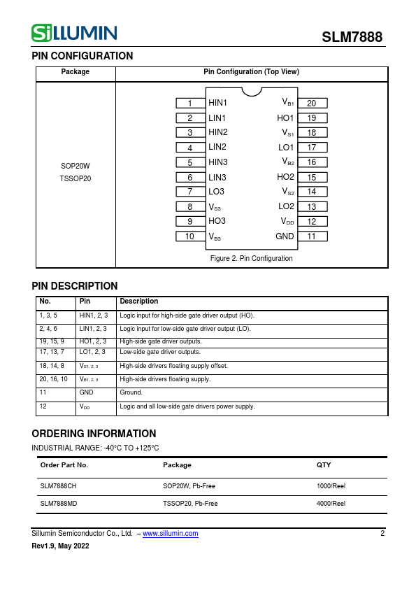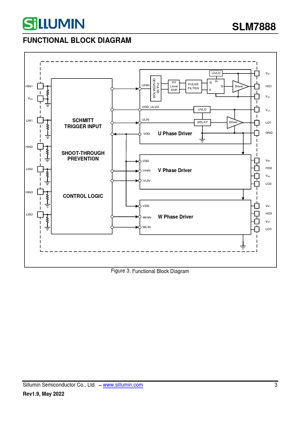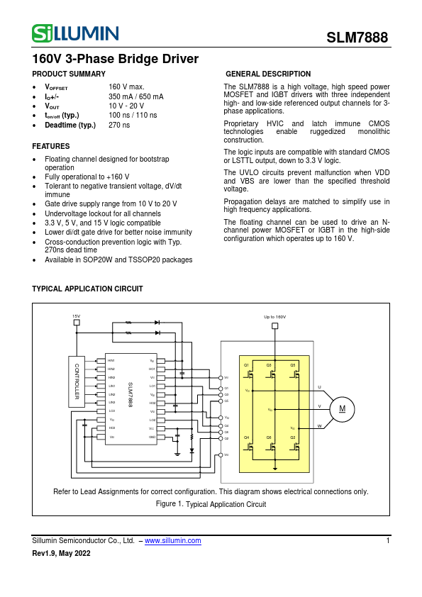 The SLM7888 is a high voltage, high speed power MOSFET and IGBT drivers with three independent high- and low-side referenced output channels for 3phase applications.