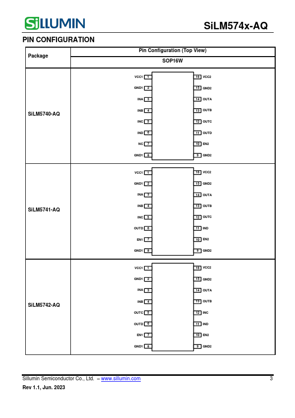 The SiLM574x-AQ devices are high performance, quad channel digital isolator with 5.0 kVRMS (SOP16W) isolation rating per UL1577. The SiLM574x-AQ devices provide high electromagnetic immunity and low emissions at low power consumption. The SiLM5740-AQ device has all channels in the same direction, the SiLM5741-AQ device has three channels in forward direction and one channel in reverse direction, and the SiLM5742-AQ...