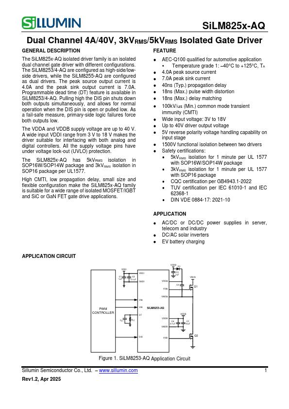 FEATURE The SiLM825x-AQ isolated driver family is an isolated dual channel gate driver with different configurations. The SiLM8253/4-AQ are configured as high-side/lowside drivers, while the SiLM8255-AQ are configured as dual drivers. The peak source output current is 4.0A and the peak sink output current is 7.0A.