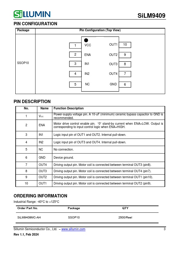 The SiLM9409 is a 2-channel low saturation voltage forward/reverse motor driver IC.