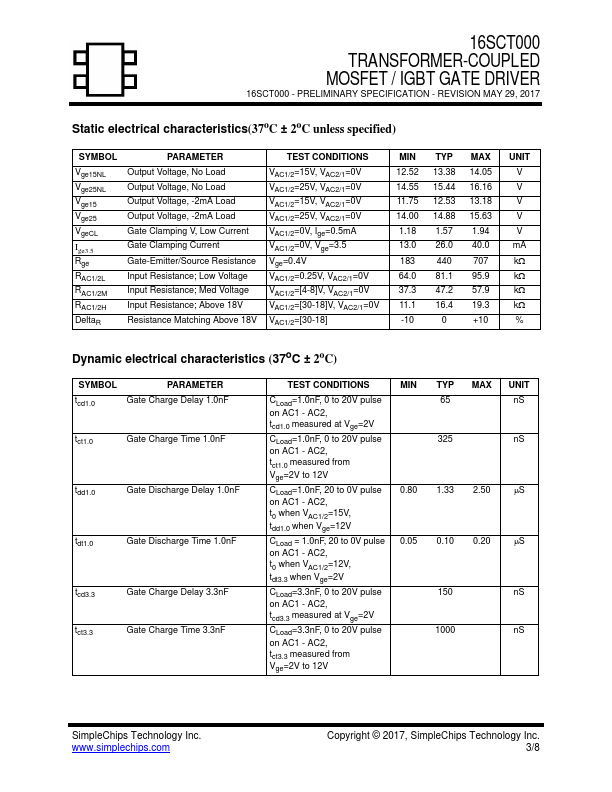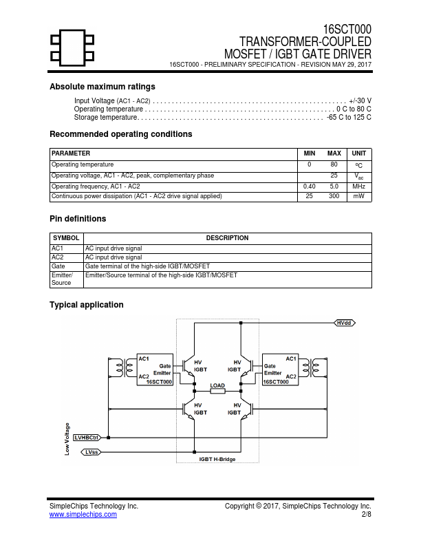 The 16SCT000 is an IGBT/MOSFET gate driver (15V nominal Vg) chip to control the conduction state of a high-side switch from the secondary of a small highvoltage isolation transformer. The 16SCT000 will drive the gate of the HV switch above the emitter/source while the secondary winding of the transformer drives the plementary input signals. Upon cessation of the input drive signals, the 16SCT000 quickly clamps the...
