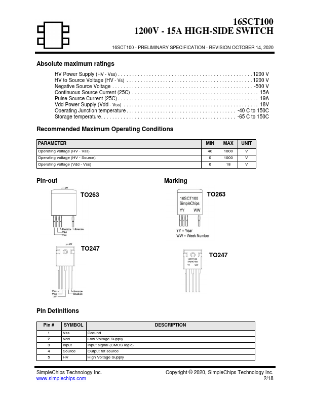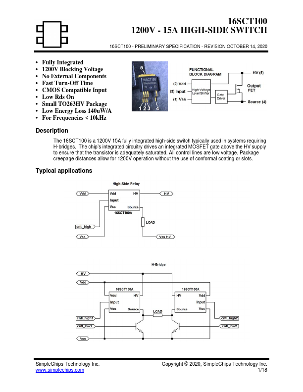 The 16SCT100 is a 1200V 15A fully integrated high-side switch typically used in systems requiring H-bridges. The chip’s integrated circuitry drives an integrated MOSFET gate above the HV supply to ensure that the transistor is adequately saturated. All control lines are low voltage.
