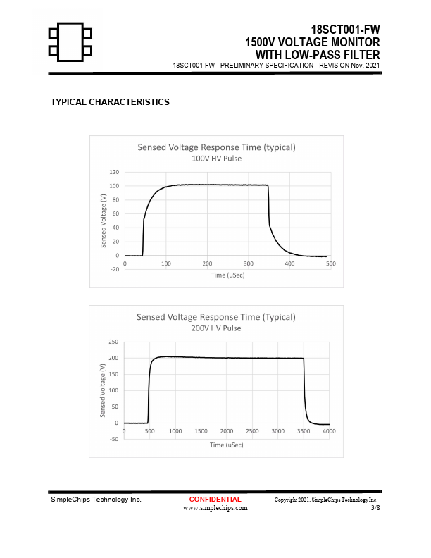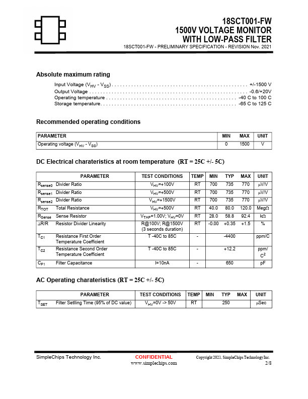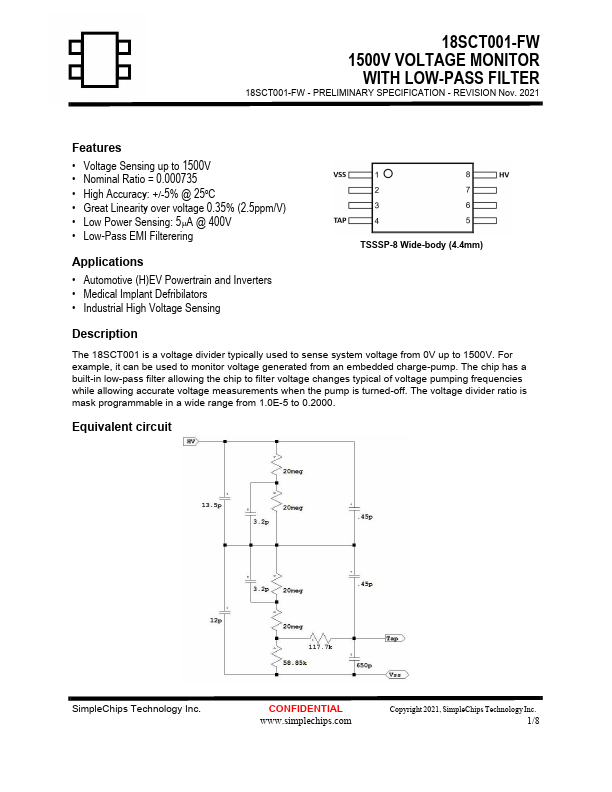 The 18SCT001 is a voltage divider typically used to sense system voltage from 0V up to 1500V. For example, it can be used to monitor voltage generated from an embedded charge-pump. The chip has a built-in low-pass filter allowing the chip to filter voltage changes typical of voltage pumping frequencies while allowing accurate voltage measurements when the pump is turned-off.