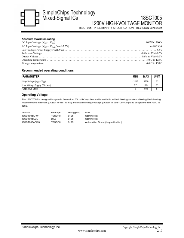 The 18SCT005 is a very accurate (+/-0.75%) voltage divider typically used to sense system voltage up to +/-1200V. The nominal gain of 3125ppm is extremely constant with temperature and voltage varying by about 4ppm from -40 to 105C at 800V. For systems using a voltage pump, the 18SCT005 has a built-in 1kHz low-pass filter eliminates noise from the effect of voltage pumping frequencies thus allowing accurate voltage...