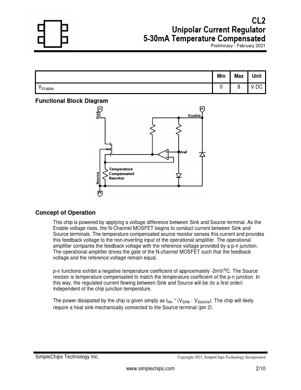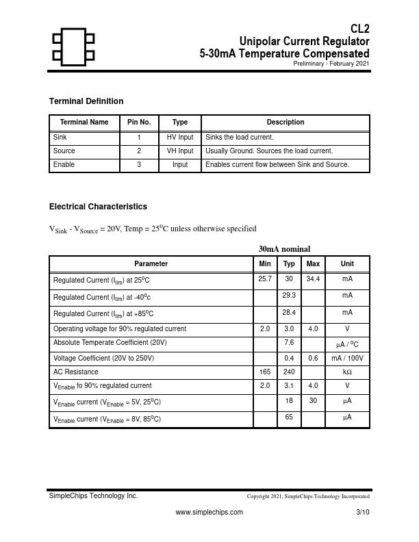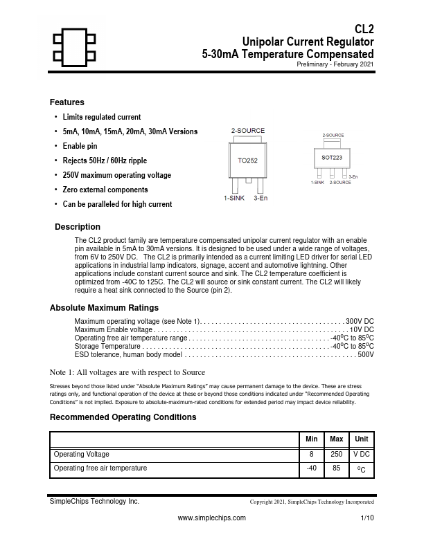 The CL2 product family are temperature pensated unipolar current regulator with an enable pin available in 5mA to 30mA versions. It is designed to be used under a wide range of voltages, from 6V to 250V DC. The CL2 is primarily intended as a current limiting LED driver for serial LED applications in industrial lamp indicators, signage, accent and automotive lightning.