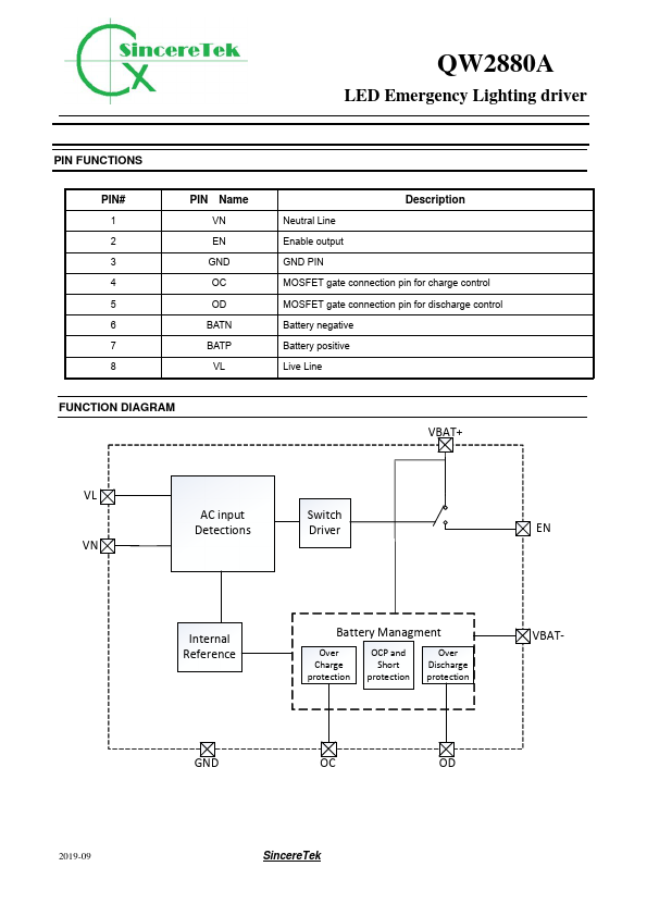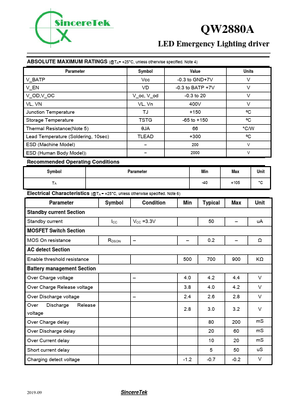 Package Reference QW2880A is a LED driver designed for Emergency Lighting., The QW2880A employs patent protected main line detecting methodology to control and drive the emergency lighting system, without any peripheral ponents.