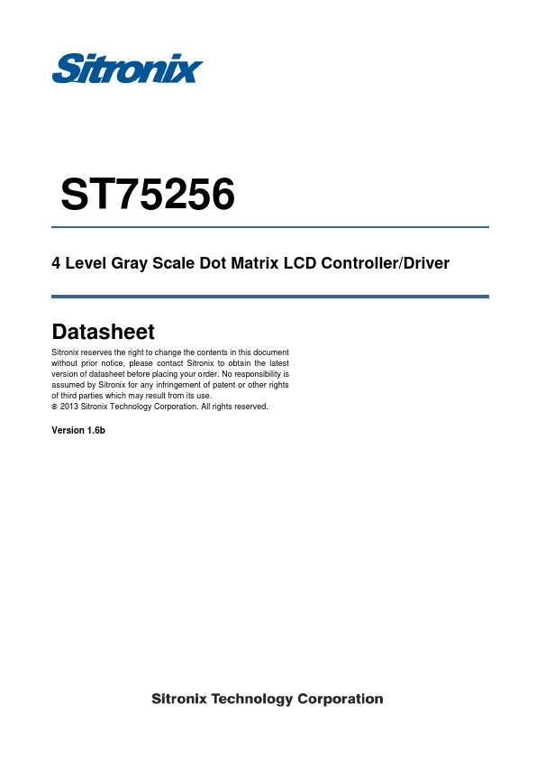 ST75256 is a driver & controller LSI for 4-level gray scale graphic dot-matrix liquid crystal display systems. It contains 256-segment and 162-common with 1-icon-common driver circuits.