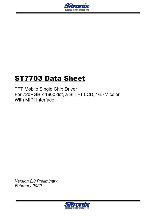 ST7703 The ST7703 is a single-chip solution for a-Si TFT LCD that combines a source driver, power supply circuit to drive a-Si TFT dot matrix LCD with 720RGBx1600 dots at maximum. The ST7703 supports MIPI Interface.
