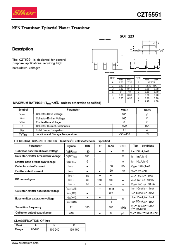 Overview: CZT5551 NPN Transistor Epitaxial Planar Transistor SOT-223.