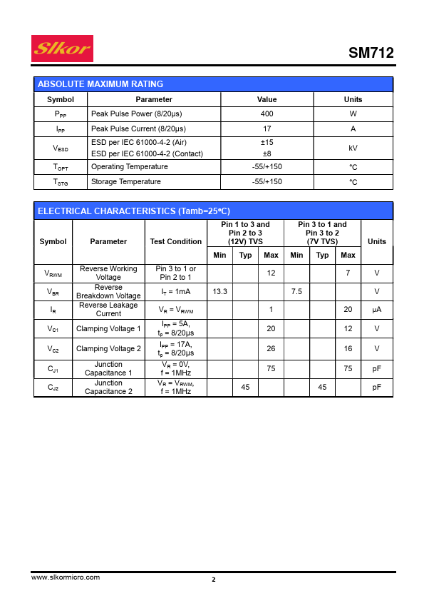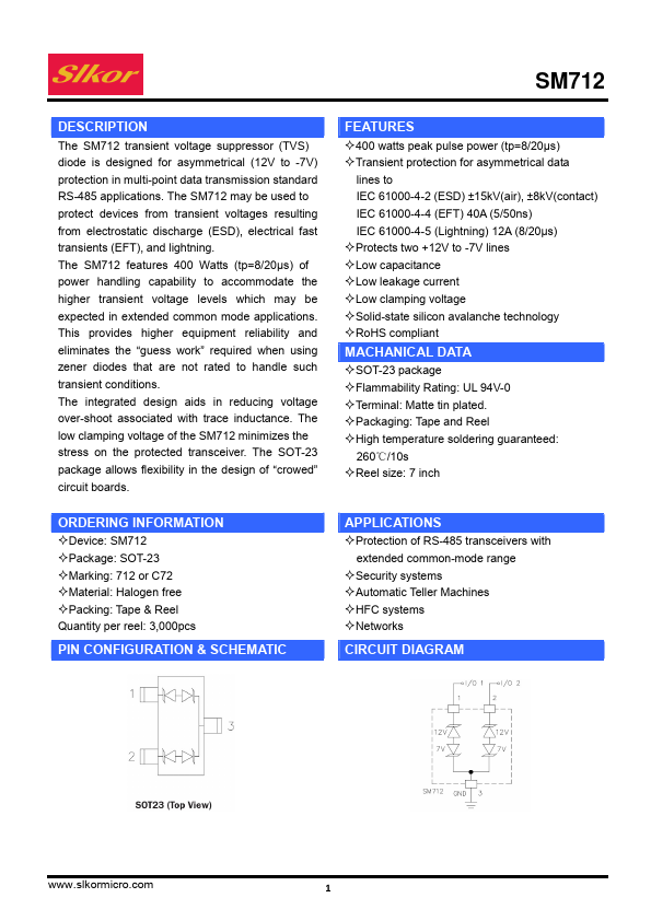 The SM712 transient voltage suppressor (TVS) diode is designed for asymmetrical (12V to -7V) protection in multi-point data transmission standard RS-485 applications. The SM712 may be used to protect devices from transient voltages resulting from electrostatic discharge (ESD), electrical fast transients (EFT), and lightning.