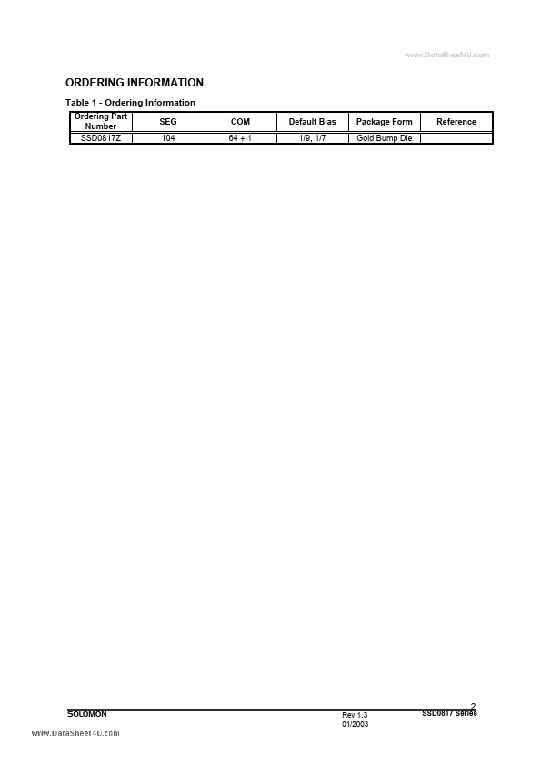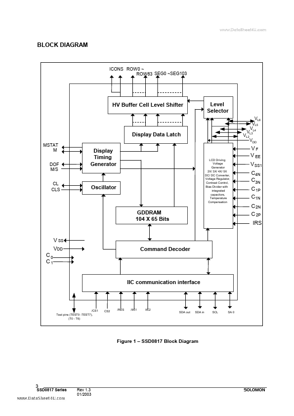 SOLOMON SYSTECH LIMITED SEMICONDUCTOR TECHNICAL DATA SSD0817 .. Advance Information CMOS LCD Segment / mon Driver with Controller SSD0817 is a single-chip CMOS LCD driver with controllers for dot-matrix graphic liquid crystal display system. It consists of 169 high-voltage driving outputs for driving maximum 104 Segments, 64 mons and 1 icon line.