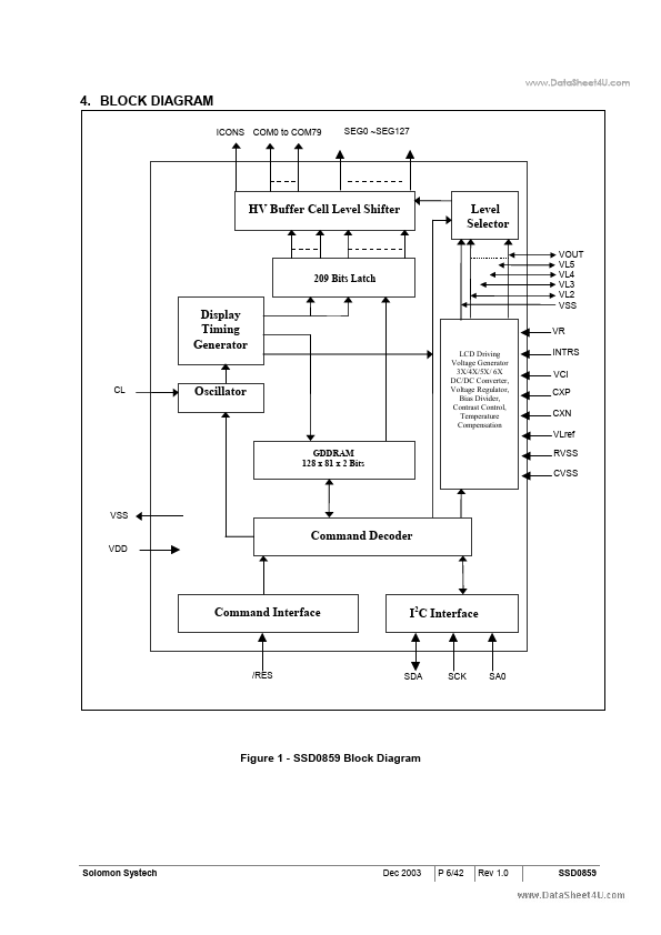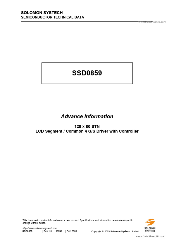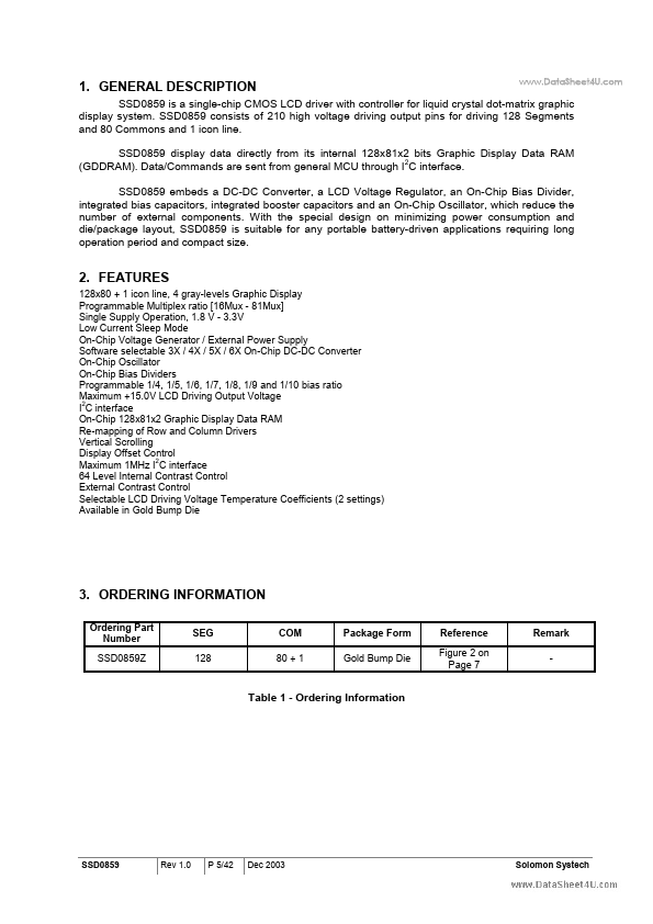 SSD0859 is a single-chip CMOS LCD driver with controller for liquid crystal dot-matrix graphic display system. SSD0859 consists of 210 high voltage driving output pins for driving 128 Segments and 80 mons and 1 icon line. SSD0859 display data directly from its internal 128x81x2 bits Graphic Display Data RAM (GDDRAM).