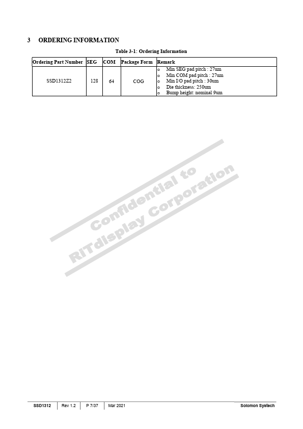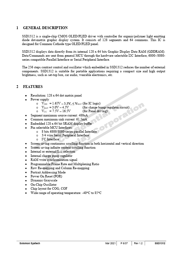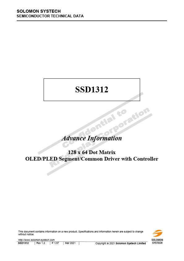 SSD1312 is a single-chip CMOS OLED/PLED driver with controller for organic/polymer light emitting diode dot-matrix graphic display system. It consists of 128 segments and 64 mons. This IC is designed for mon Cathode type OLED/PLED panel.