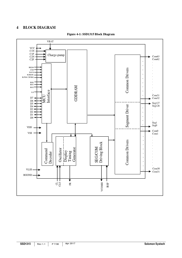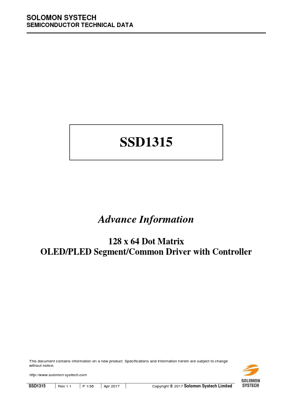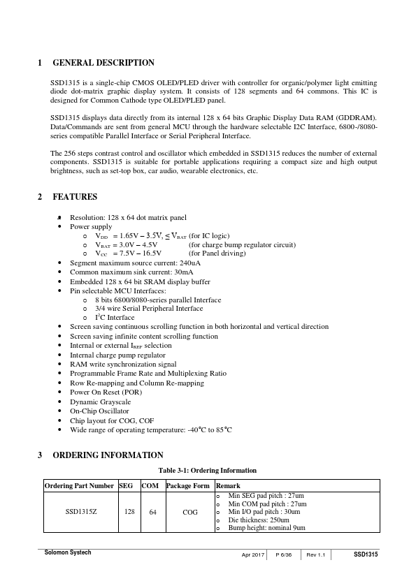 SSD1315 is a single-chip CMOS OLED/PLED driver with controller for organic/polymer light emitting diode dot-matrix graphic display system. It consists of 128 segments and 64 mons. This IC is designed for mon Cathode type OLED/PLED panel.