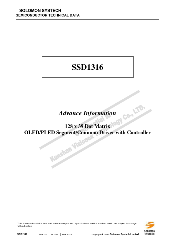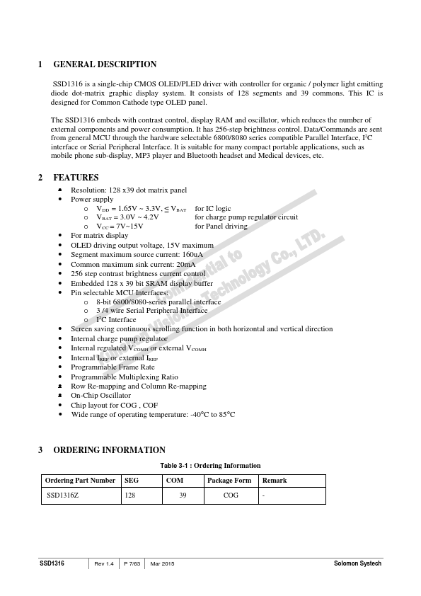 SSD1316 is a single-chip CMOS OLED/PLED driver with controller for organic / polymer light emitting diode dot-matrix graphic display system. It consists of 128 segments and 39 mons. This IC is designed for mon Cathode type OLED panel.