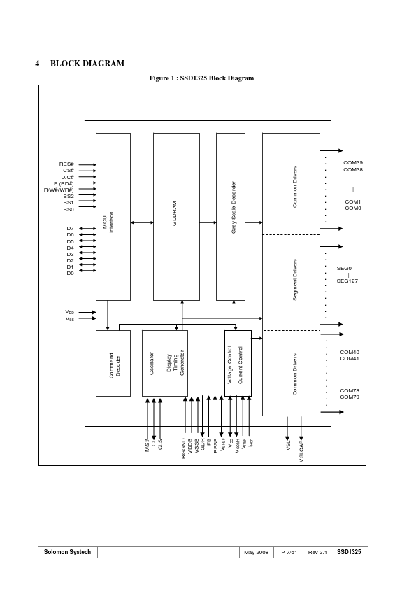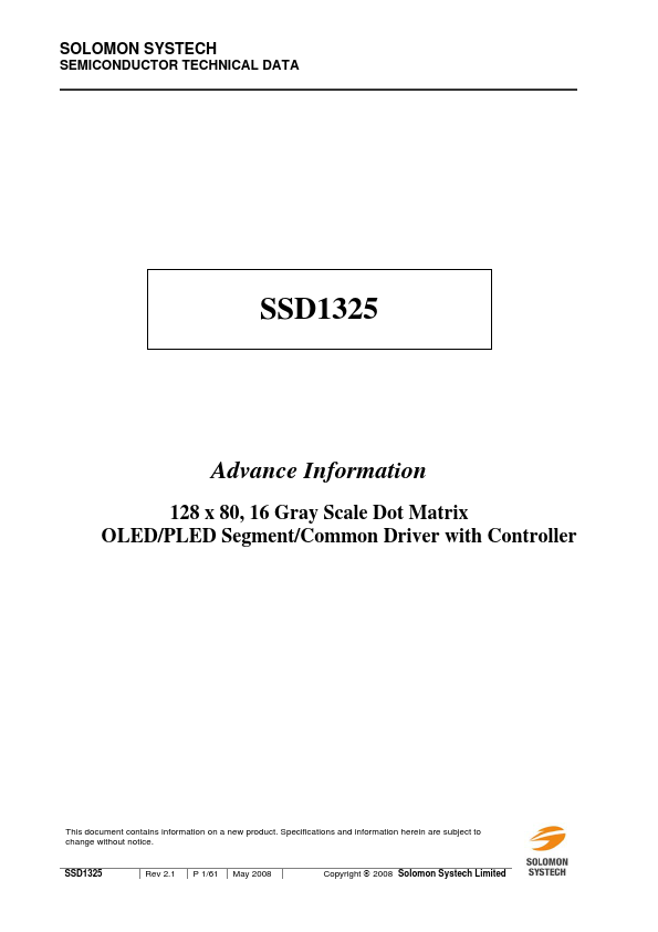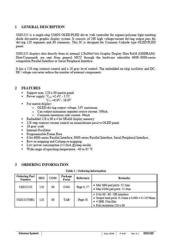 SSD1325 is a single-chip CMOS OLED/PLED driver with controller for organic/polymer light emitting diode dot-matrix graphic display system. It consists of 208 high voltage/current driving output pins for driving 128 segments and 80 mons. This IC is designed for mon Cathode type OLED/PLED panel.