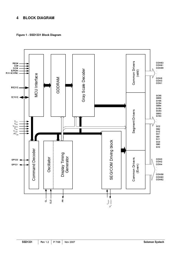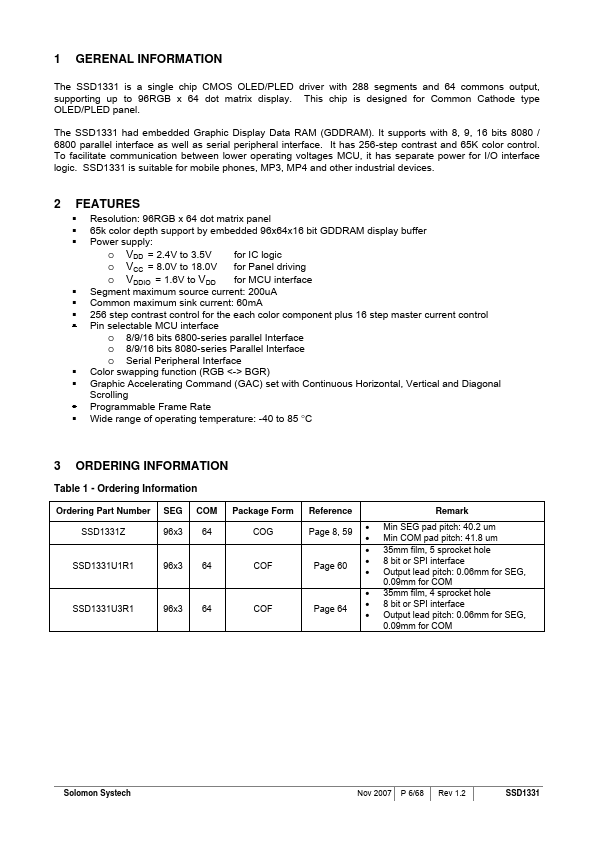 SOLOMON SYSTECH SEMICONDUCTOR TECHNICAL DATA SSD1331 Advance Information 96RGB x 64 Dot Matrix OLED/PLED Segment/mon Driver with Controller This document contains information on a new product. Specifications and information herein are subject to change without notice. This chip is designed for mon Cathode type OLED/PLED panel.