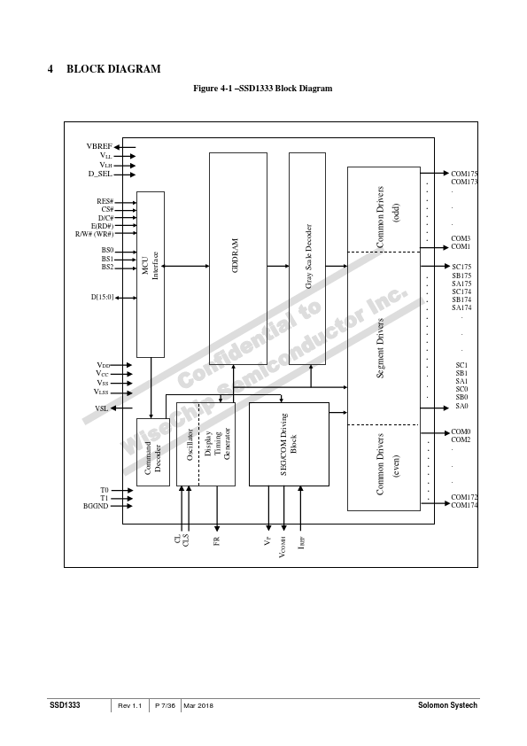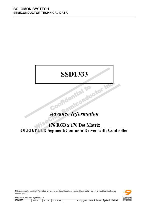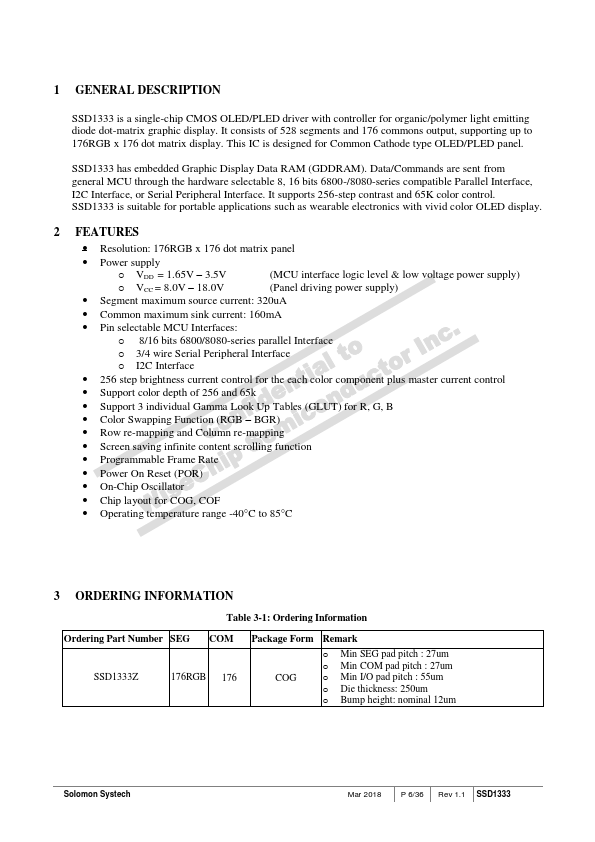 SSD1333 is a single-chip CMOS OLED/PLED driver with controller for organic/polymer light emitting diode dot-matrix graphic display. It consists of 528 segments and 176 mons output, supporting up to 176RGB x 176 dot matrix display. This IC is designed for mon Cathode type OLED/PLED panel.