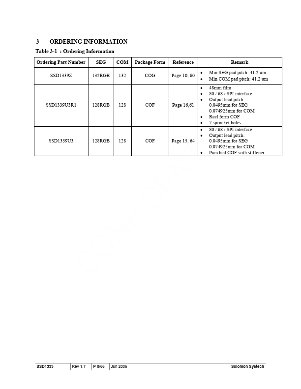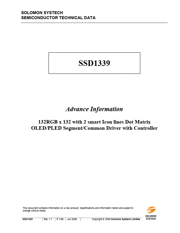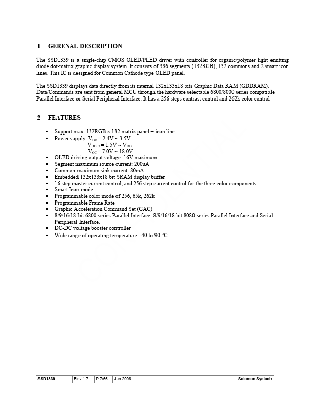 The SSD1339 is a single-chip CMOS OLED/PLED driver with controller for organic/polymer light emitting diode dot-matrix graphic display system. It consists of 396 segments (132RGB), 132 mons and 2 smart icon lines. This IC is designed for mon Cathode type OLED panel.