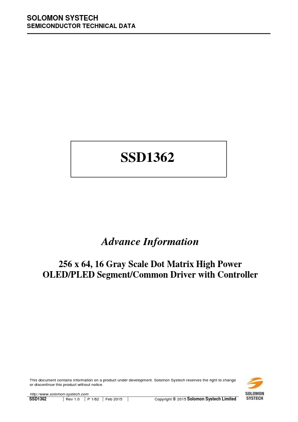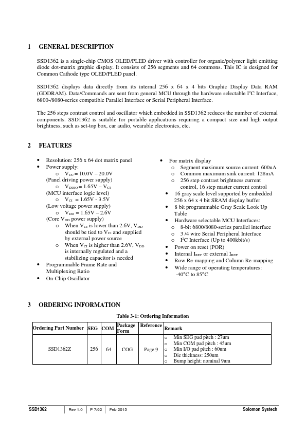SSD1362 is a single-chip CMOS OLED/PLED driver with controller for organic/polymer light emitting diode dot-matrix graphic display. It consists of 256 segments and 64 mons. This IC is designed for mon Cathode type OLED/PLED panel.