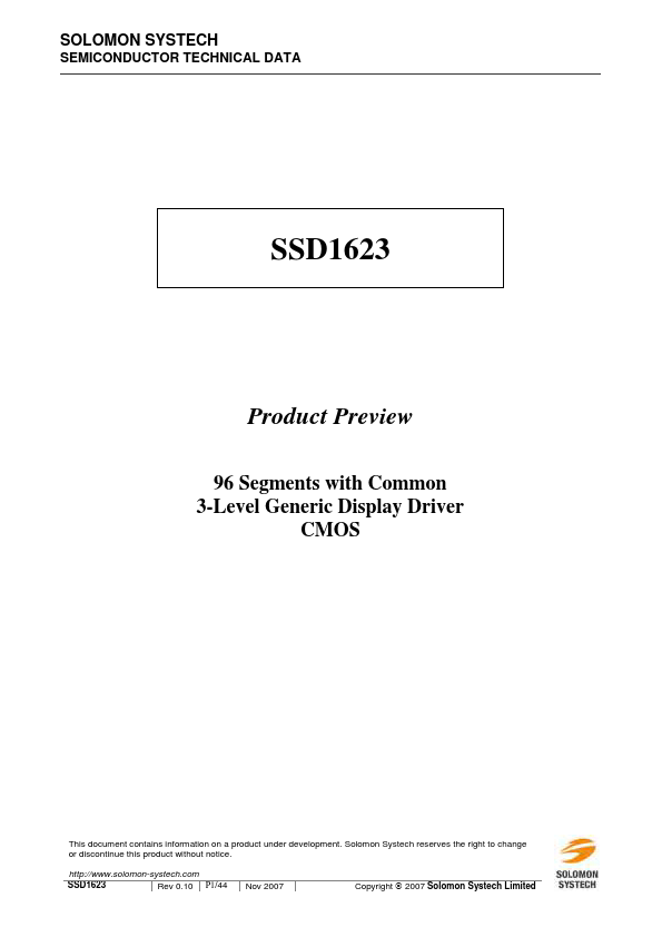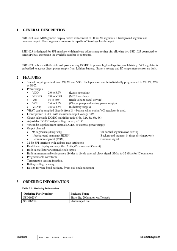 SSD1623 is a CMOS generic display driver with controller. It has 95 segments, 1 background segment and 1 mon output. Each segment / mon is capable of 3-voltage levels output.