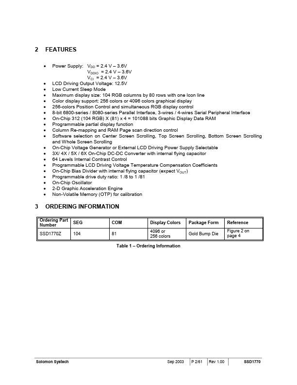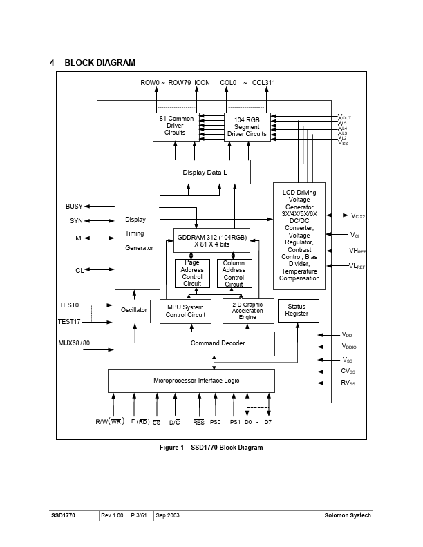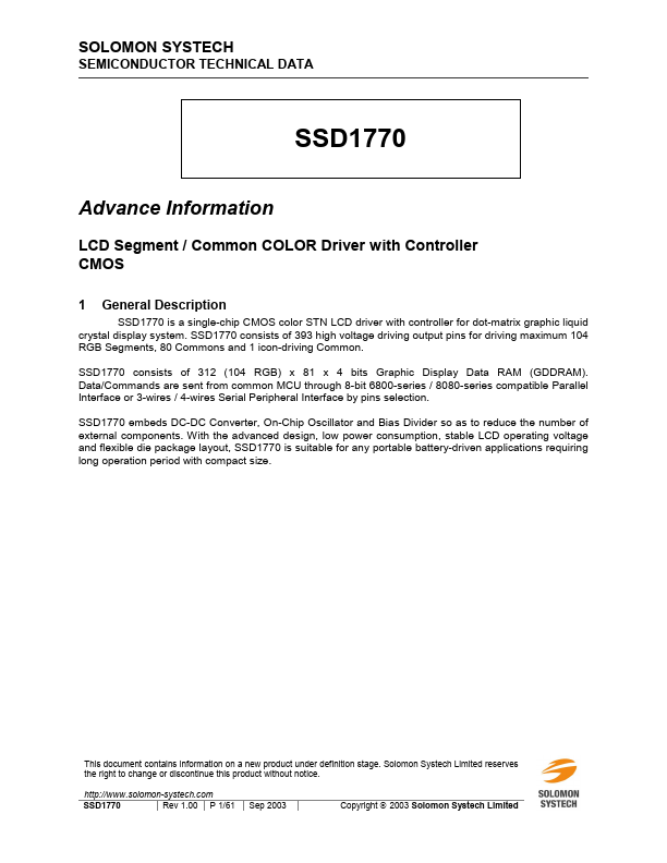 SSD1770 is a single-chip CMOS color STN LCD driver with controller for dot-matrix graphic liquid crystal display system. SSD1770 consists of 393 high voltage driving output pins for driving maximum 104 RGB Segments, 80 mons and 1 icon-driving mon. SSD1770 consists of 312 (104 RGB) x 81 x 4 bits Graphic Display Data RAM (GDDRAM).