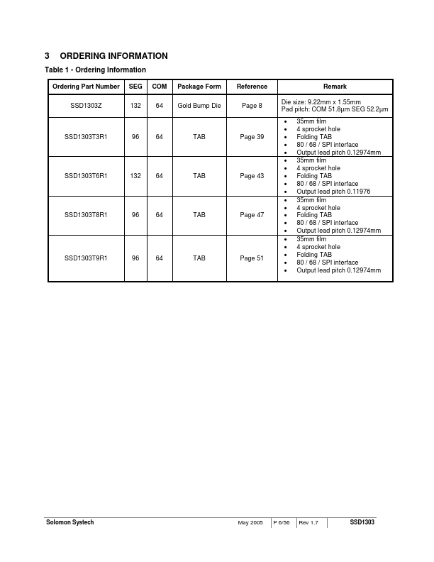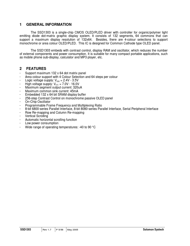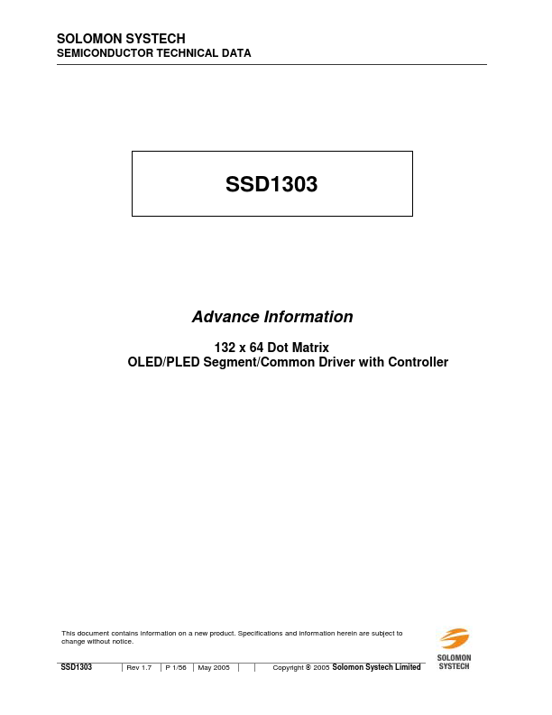 SOLOMON SYSTECH SEMICONDUCTOR TECHNICAL DATA SSD1303 Advance Information 132 x 64 Dot Matrix OLED/PLED Segment/mon Driver with Controller This document contains information on a new product. Specifications and information herein are subject to change without notice. SSD1303 Rev 1.7 P 1/56 May 2005 Copyright 2005 Solomon Systech Limited 1 GENERAL INFORMATION The SSD1303 is a single-chip CMOS OLED/PLED driver with...