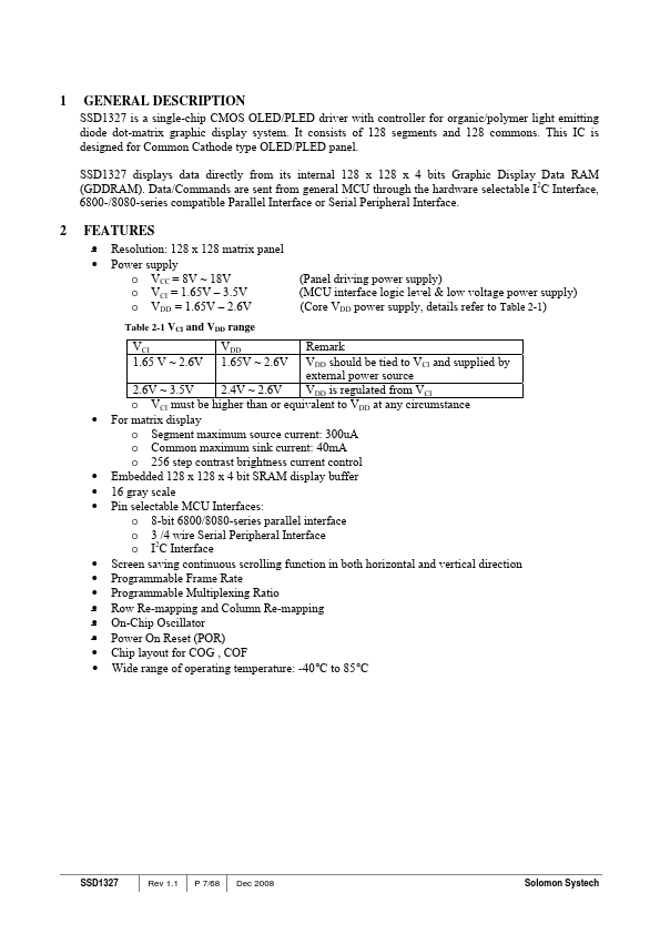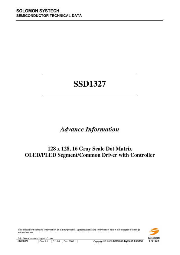 SSD1327 is a single-chip CMOS OLED/PLED driver with controller for organic/polymer light emitting diode dot-matrix graphic display system. It consists of 128 segments and 128 mons. This IC is designed for mon Cathode type OLED/PLED panel.