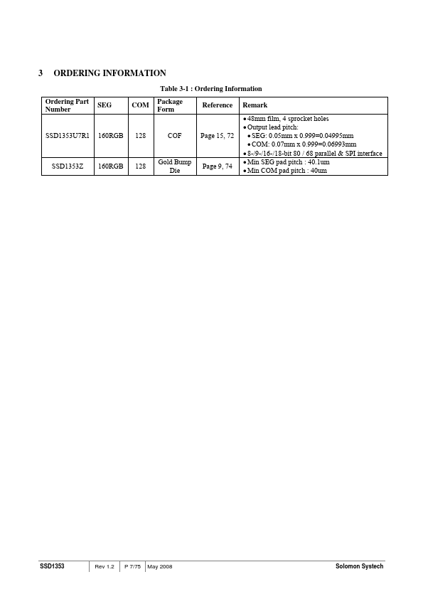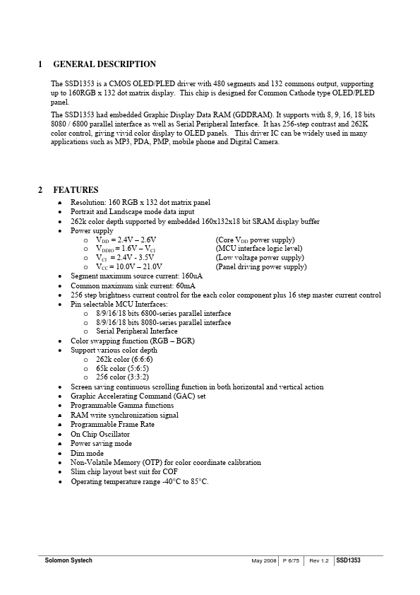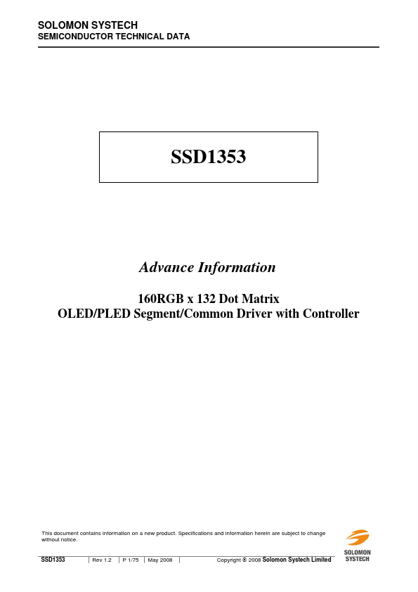 The SSD1353 is a CMOS OLED/PLED driver with 480 segments and 132 mons output, supporting up to 160RGB x 132 dot matrix display. This chip is designed for mon Cathode type OLED/PLED panel. The SSD1353 had embedded Graphic Display Data RAM (GDDRAM).