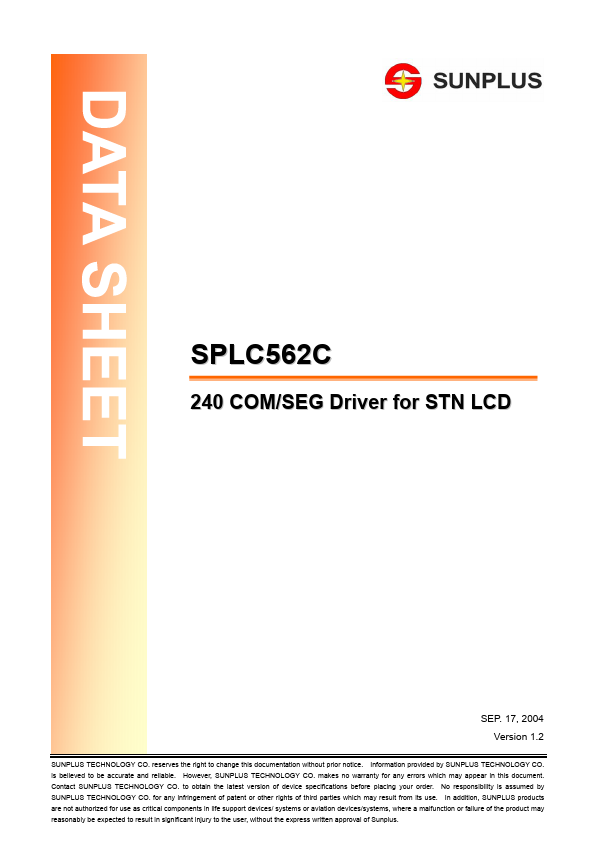 The SPLC562C is a 240-output segment/common driver IC - Common Mode suitable for driving large/medium scale dot matrix LCD panels, and g Built-in 240 bits bi-directional shift register is used in personal computers/work-stations. Through the use of (divisible into 120-bits X 2) SST (Super Slim TCP) technology, it is ideal for substantially g Shift clock frequency: 4.0MHz (Max.) decreasing the size of the frame section of the LCD module.
