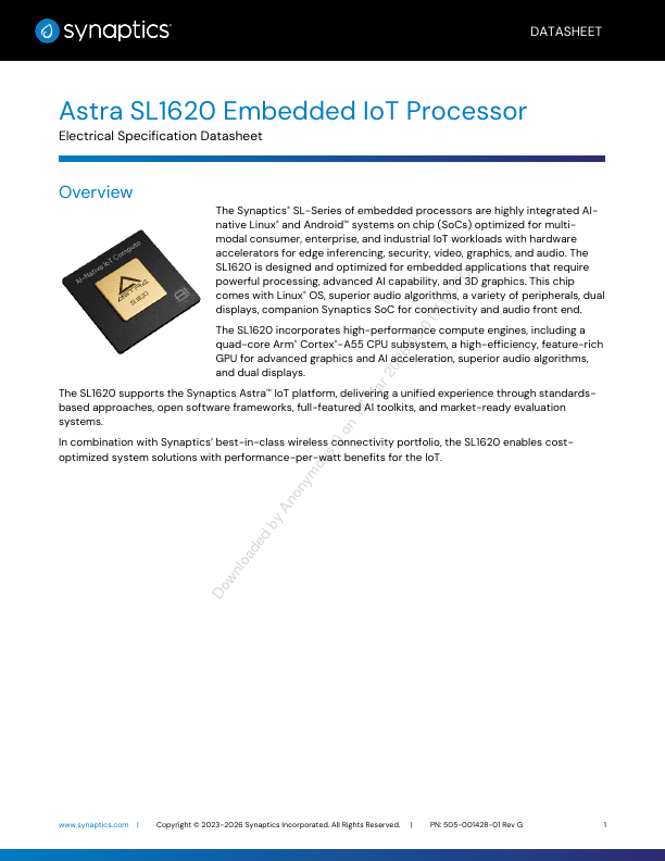 The Synaptics® SL-Series of embedded processors are highly integrated AInative Linux® and Android™ systems on chip (SoCs) optimized for multimodal consumer, enterprise, and industrial IoT workloads with hardware accelerators for edge inferencing, security, video, graphics, and audio. The SL1620 is designed and optimized for embedded applications that require powerful processing, advanced AI capability, and 3D graphics. This chip es with Linux® OS, superior audio algorithms, a variety of peripherals, dual displays, panion Synaptics SoC for connectivity and audio front end.