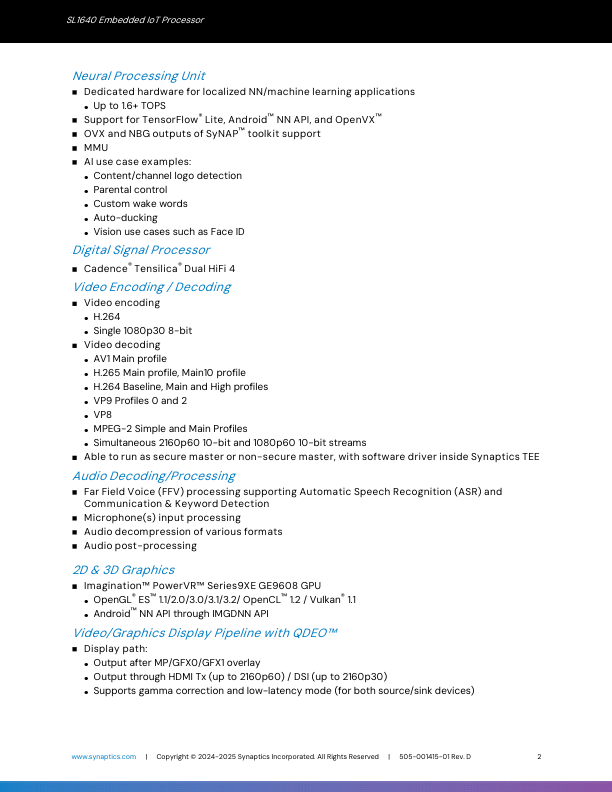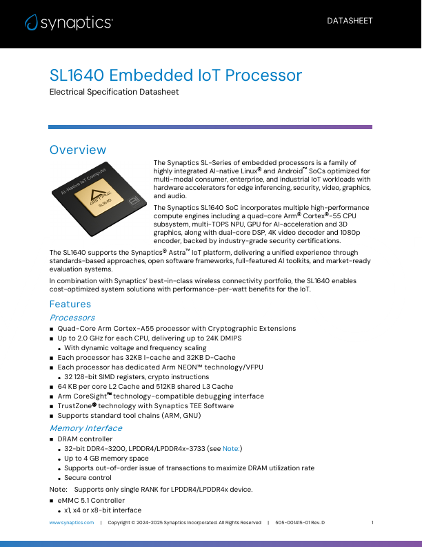 The Synaptics SL1640 SoC incorporates multiple high-performance pute engines including a quad-core Arm® Cortex®-55 CPU subsystem, multi-TOPS NPU, GPU for AI-acceleration and 3D graphics, along with dual-core DSP, 4K video decoder and 1080p encoder, backed by industry-grade security certifications. The SL1640 supports the...