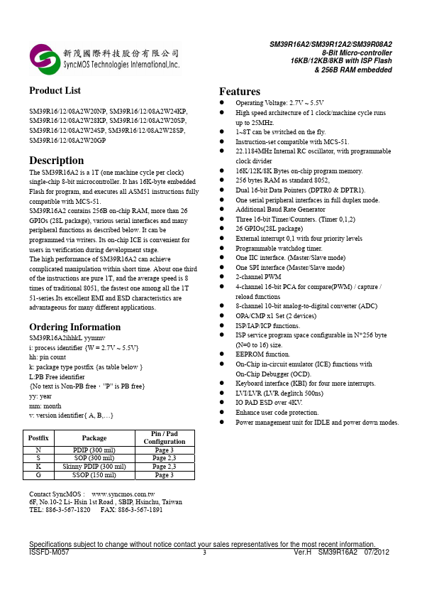 The SM39R16A2 is a 1T (one machine cycle per clock) single-chip 8-bit microcontroller. It has 16K-byte embedded Flash for program, and executes all ASM51 instructions fully compatible with MCS-51.